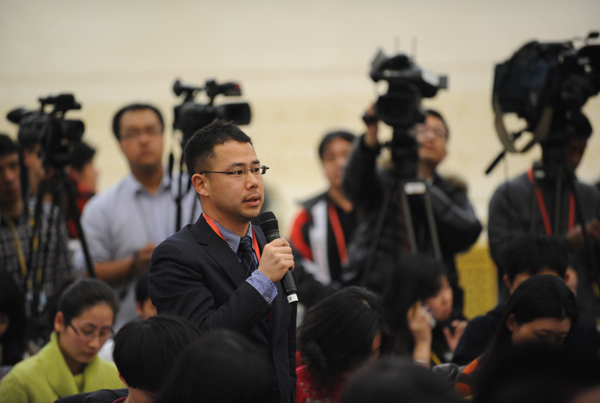 2012年3月2日15時,全國政協(xié)十一屆五次會議新聞發(fā)布會在人民大會堂三樓金色大廳召開,大會新聞發(fā)言人趙啟正向中外媒體介紹本次大會有關情況,并回答記者提問。圖為日本朝日電視臺記者提問。陳競超 攝