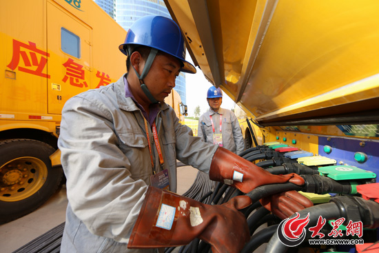 濟(jì)南供電公司保電隊(duì)員調(diào)試發(fā)電車(chē)