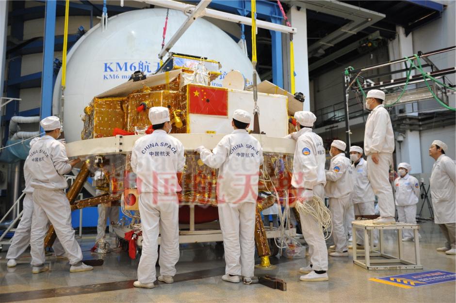 圖為2013年4月,在北京唐家?guī)X的五院衛(wèi)星總裝試驗大廳(簡稱AIT大廳)內,五院總裝與環(huán)境工程部的試驗人員們正在進行嫦娥三號探測器的熱試驗準備工作,通過本次試驗來最終確認其能否忍受在奔月、落月過程中所要承受的嚴峻考驗。(資料圖)圖片來源:中國航天報