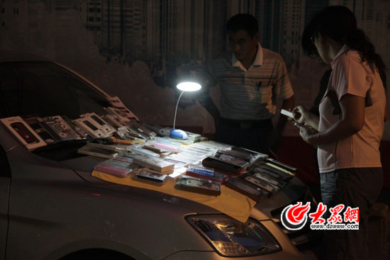 8月2日晚,兼職商販開(kāi)著私家車(chē)正在泉城廣場(chǎng)東南售賣(mài)手機(jī)殼,他將車(chē)前蓋上鋪滿(mǎn)手機(jī)殼,引來(lái)不少市民。