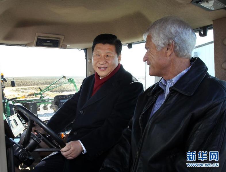2012年2月16日,正在美國訪問的國家副主席習近平在美國艾奧瓦州參觀考察該州金伯利農場。這是習近平在農場主金伯利的陪同下操作其農用機械。新華社記者蘭紅光攝