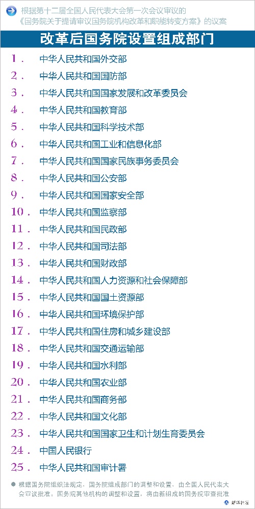 10日披露的國務(wù)院機(jī)構(gòu)改革和職能轉(zhuǎn)變方案表明,新一輪國務(wù)院機(jī)構(gòu)改革即將啟動,國務(wù)院組成部門將減少至25個。