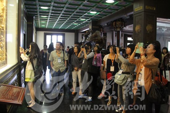 采訪團成員用鏡頭記錄著超然樓內各種有關泉城的木雕藝術品。見習記者 馬俊驥 攝
