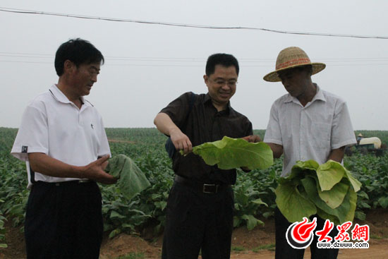 劉書記正和太白村書記魏金廷(左一)及村主任魏敬成(右一)討論如何判斷煙葉成熟了。