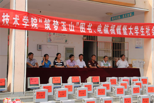 活動第一站是玉山小學,“第一書記”首先帶領同學們參觀了魯商集團捐建的教學樓,幫助他們了解“第一書記”的幫扶工作和農村現狀。接著同學們來到鎮武小學,為學校送來了30臺電腦和300本圖書,并舉行了簡短的“山東商業職業技術學院社會實踐基地”掛牌儀式。