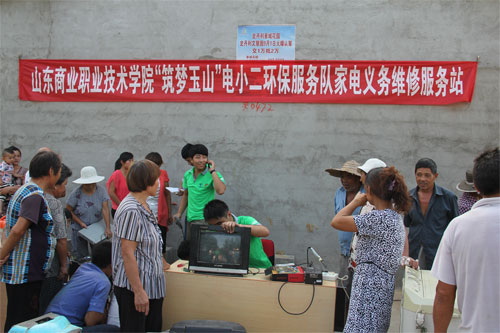 第二站是魯商集團“第一書記”幫包村之一坊聯村,山東商業職業技術學院的“電小二”家電維修小組在村委大院前設立維修站,義務為村民維修家電。村民紛紛把家里損壞的家電送來,夏末秋初的天氣依然很熱,同學們全然不顧滿臉的汗水,聚精會神地給村民講解電器使用注意事項,以及如何延長電器使用壽命。活動中,同學們共為村民免費維修電器80臺。