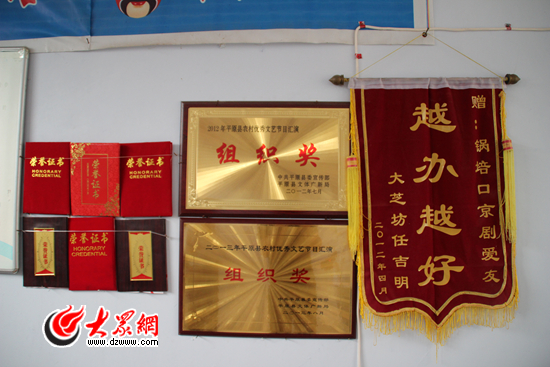 腰站鎮鍋培口村的京劇社越辦越好,“草臺班子”拿到的榮譽掛滿了墻。記者 滿志旺 攝