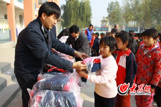 來自省食品藥品監(jiān)督管理局的“第一書記”王洪坤向柿園小學的孩子們送上了校服。記者 張帆 攝
