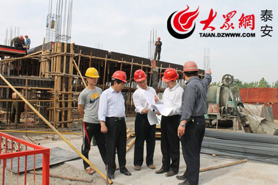 “第一書記”郭占祿(右二)在社區舊村改造施工現場。(記者 張冉 攝影報道)