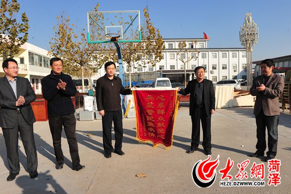 東明縣菜園集鎮黨委書記彭金儉(右二)向山東省公安廳警務保障部副主任許新華(左三)贈送錦旗 省公安廳派駐東明縣菜園集鎮白店村“第一書記”李忠表示,今后將繼續把黨建工作放在首位,踐行“抓黨建促脫貧”工作思路,將“第一書記”工作落到實處。