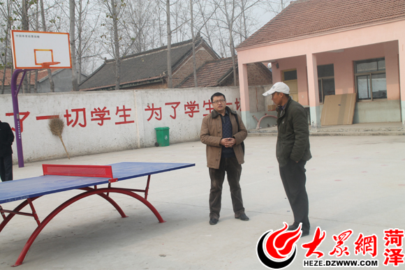 “第一書記”程?hào)|杰(左)與袁閣村村支書劉建軍商討學(xué)校體育器材問(wèn)題