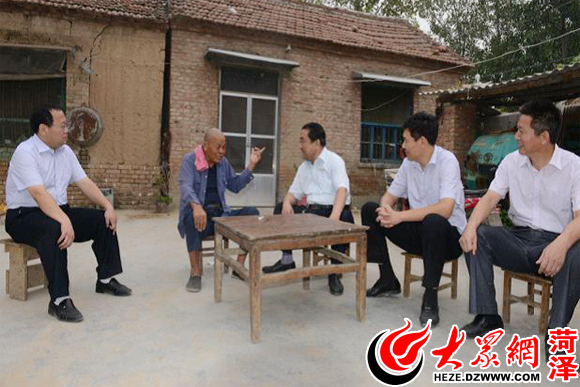 菏澤學院黨委書記張存金(中)在和李傳峰(右一)到孔莊村孔慶雷(左二)家中進行走訪調研