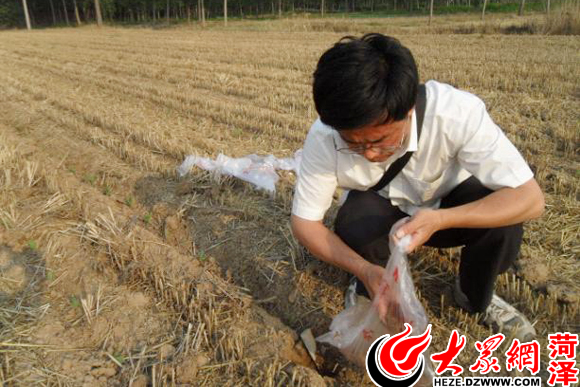 李建奇在南孫村田間取土壤樣品,為測土配方施肥提供科學依據
