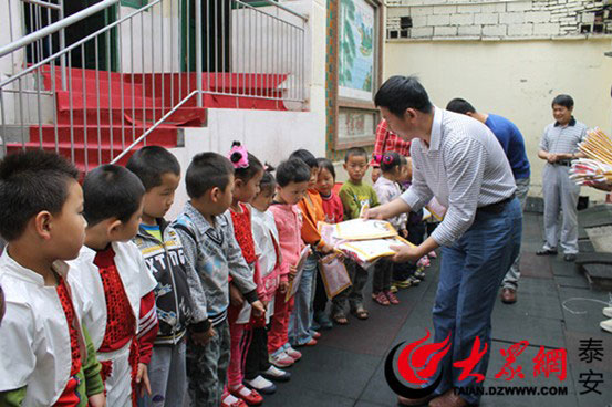 “第一書記”郭占祿、王振宇走進社區學校給孩子們送禮物。(記者 張冉 攝影報道)