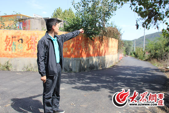“第一書(shū)記”亓振軍手指村內(nèi)柏油路介紹柏情況。