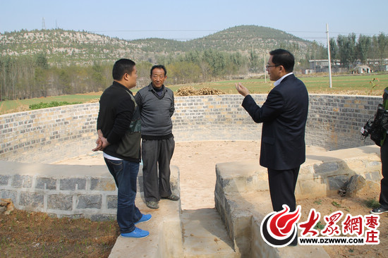 張莊村“第一書記”滕聿峰(右)與施工方一起商議蓄水池的問題。