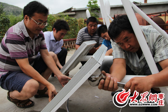 白莊村“第一書記”楊蒙山(左)和工人師傅們一起安裝太陽能路燈。