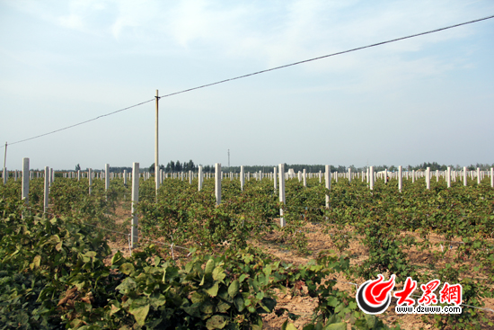 在葡萄園內(nèi),記者看到,地里林立的水泥樁上纏滿了鐵絲搭建的“墻”,沿墻生長的葡萄苗已經(jīng)有一米多高。兩排葡萄苗之間空出來的土地剛剛翻新,趙長新說,這是村民插空種花生的地方,前幾天花生剛剛收獲完。