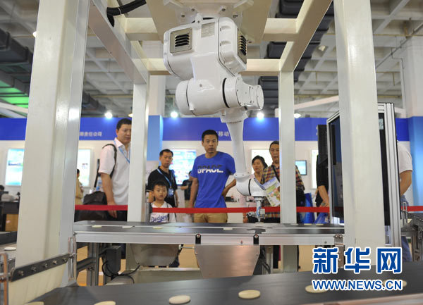 在第十六屆中國北京國際科技產(chǎn)業(yè)博覽會(huì)上,一款新型高速搬運(yùn)機(jī)器人吸引了參觀者的目光。新華社記者 魯鵬 攝