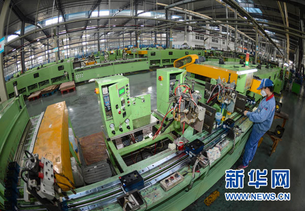 工人在天能循環(huán)經(jīng)濟(jì)產(chǎn)業(yè)園內(nèi)的全自動(dòng)蓄電池裝配生產(chǎn)線上作業(yè)。新華社記者 徐昱 攝