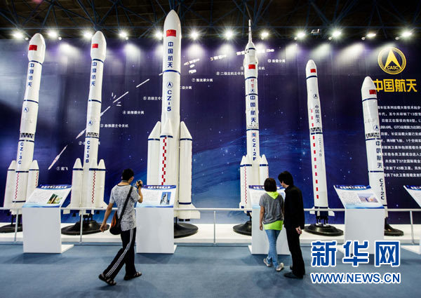 觀眾在第十六屆中國北京國際科技產(chǎn)業(yè)博覽會(huì)航天科技專題展區(qū)參觀我國長征系列運(yùn)載火箭的模型。新華社記者 羅曉光 攝