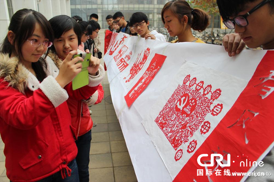 11月9日,在山東聊城大學(xué),大學(xué)生志愿者們在展示創(chuàng)作的剪紙作品,以慶祝黨的十八屆三中全會(huì)的召開。