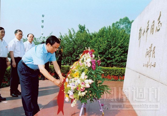 圖:2005年10月22日,深圳蓮花山公園,賀國強向鄧小平塑像獻花籃。
