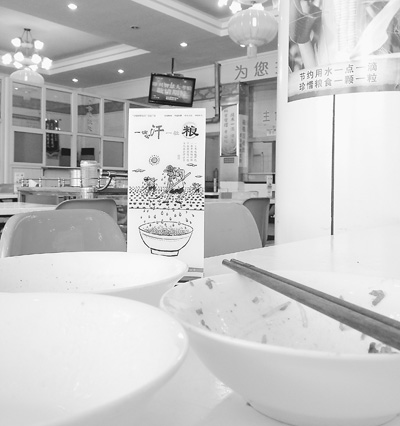 找到座位后,記者最先被桌上的一個宣傳牌吸引,宣傳牌上是一幅由河北邱縣農民漫畫家創作的漫畫,畫中兩位農民在烈日下勞作,漫畫旁邊配了一首名為《一滴汗一粒糧》的小詩:“一日不吃餓得慌,一季不吃餓斷腸,手拍胸膛想一想,節約糧食理應當!贝送狻胺磳速M”“光盤行動”“節約用水”等宣傳語和宣傳畫也隨處可見。