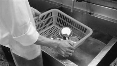 廣藥食堂員工在清洗提供小份菜的餐具。記者賀林平攝