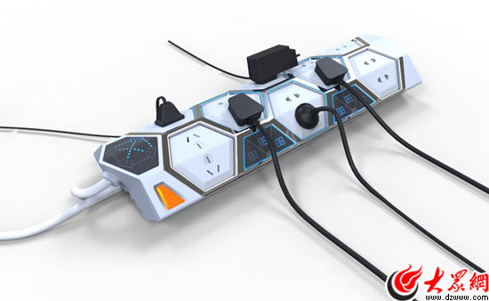 設計說明:蜂巢是六邊形模塊組合,多種拼接方式,具有強大的相互聯系性。設計以蜂巢形態為切入點,利用基本六邊形模塊,完成模塊之間的多種拼接擴展與多程控制。六邊形模塊的立體拼接是插頭擁擠問題得以解決,電量統計使用電量化。模塊化設計試生產使用更加自由,增強插排的適應性與宜人性。