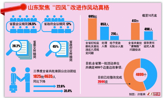 7月初,黨的群眾路線教育實踐活動啟動后,我省聚焦“四風”問題,先后開展兩期12項專項清理整頓工作,取得階段性成果:會議文件簡報被大幅精簡,省委、省政府會議分別精簡24.5%、17%,文件分別精簡28.2%、45%,簡報分別精簡72.5%、24%;省委議事協調機構保留48個,精簡調整51個,省政府議事協調機構和聯席會議撤銷(包括合并)127個,只保留85個;停建樓堂館所和清理辦公用房完成數據匯總摸清了“底數”;三季度全省共批準因公出訪團組1825批4635人,同比下降22.6%和31.4%;規范國有企業職務消費和處理違規用車,32戶省管國有企業負責人職務消費同比下降36.9%,糾正處理違規車輛760輛;全省各級黨政機關在職干部職工、事業單位中層以上領導干部1059944人,國有和國有控股企業中層以上領導和關鍵崗位人員23603人,全部作出會員卡“零持有”報告。其他幾項工作也正積極推進。