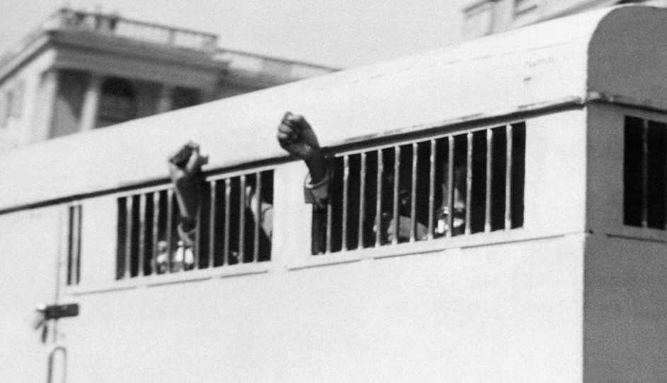 1961年6月曼德拉創建非國大軍事組織“民族之矛”,任總司令。1962年8月,曼德拉被捕入獄,南非政府以“煽動”罪和“非法越境”罪判處他5年監禁。1964年6月,曼德拉又被指控犯有“企圖以暴力推翻政府”,改判為無期徒刑。圖為包括曼德拉在內的8人在1964年6月16日離開比勒陀利亞的司法大樓時從鐵窗內伸出拳頭。