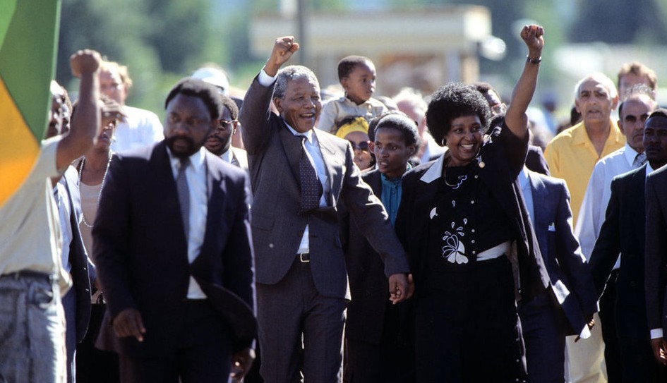1990年2月10日, 南非總統(tǒng)德克勒克宣布無條件釋放曼德拉,1990年2月11日,在監(jiān)獄中度過了27年的曼德拉終于重獲自由。圖為曼德拉與妻子溫妮攜手步出監(jiān)獄大門,并向支持者揮手致意。
