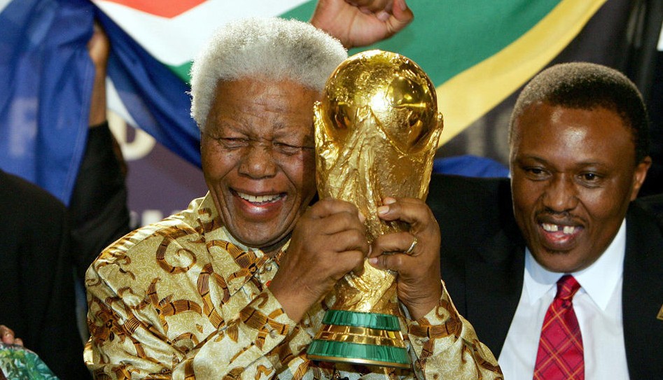 2004年5月16日,南非獲得2010年世界杯主辦權。時年85歲的曼德拉在眾人簇擁之下走上前臺,將大力神杯緊緊摟在懷里。據媒體分析,南非在最后時刻脫穎而出,很大程度上正是因為曼德拉以濃厚的感情打動了所有人的心,“當我被關在羅本島上的時候,我唯一接觸世界杯的方式就是收聽廣播,這也是我唯一的樂趣。”曼德拉用這樣的話語詮釋了南非舉辦世界杯的決心,也最終讓世界杯第一次落戶非洲大陸。圖為當國際足聯宣布南非獲得世界杯主辦權時,曼德拉喜極而泣,將大力神杯緊緊摟在懷里。