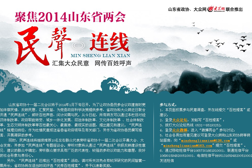 同時,“民聲連線”將同步啟動“百姓提案”的征集活動,您可以寫出自己最關注的、有廣泛代表性的社會問題,并分析原因癥結、提出可操作性強的改進舉措,形成“百姓提案”,通過大眾網提交省政協。
