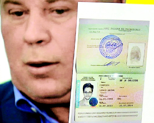 □新華社發(fā) 俄羅斯律師向媒體展示允許斯諾登進(jìn)入俄羅斯境內(nèi)臨時(shí)文件的照片。