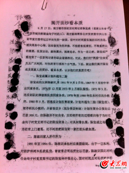 金溝子村村委委員陳廣澤對大眾網記者說,2011年6月份,村委召開黨員、村民代表大會,78名黨員、村民代表一致聯名書寫《揭開面紗看本質》,揭露陳寶成“顛倒黑白”行為,并在該篇文章上簽名、并按手印。