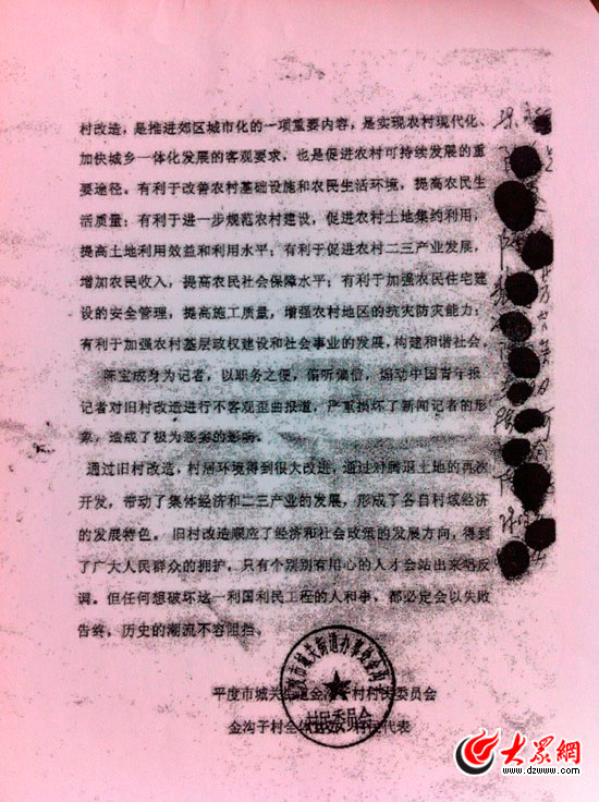 當時簽字并按手印的60多歲金溝子村村民代表陳國升在接受大眾網采訪時說,陳寶成是我們從小看到大的孩子,他考上了中國政法大學,全村都覺得臉上有光。但沒想到的是,學成歸來后,幾次三番地跟村委、跟村民、跟舊村改造作對,一折騰就是六七年,村里發展的很多大事都被他給耽誤了。