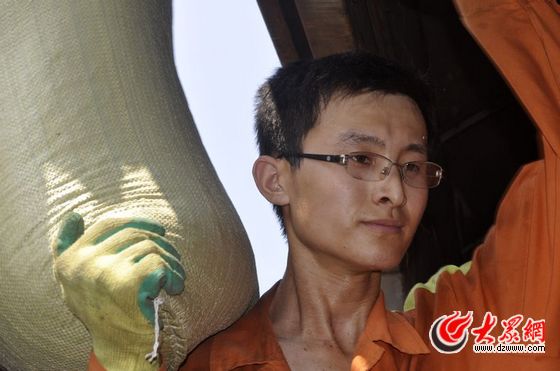 25歲,瘦高,帥氣,眼鏡,文質彬彬,誰能想象他是一名裝卸工人?少言寡語,少有笑容,比身體還重的麻包并不能壓彎他的腰。王琨 攝