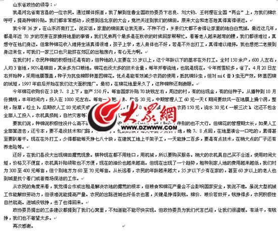今年36歲的任興剛最近幾年來一直在山東濟南打工,3月7日,當他通過報紙和網絡看到三位住魯全國政協委員呼吁提高種棉補貼的報道后,非常感動,立即給山東省政協寫信表達感謝。