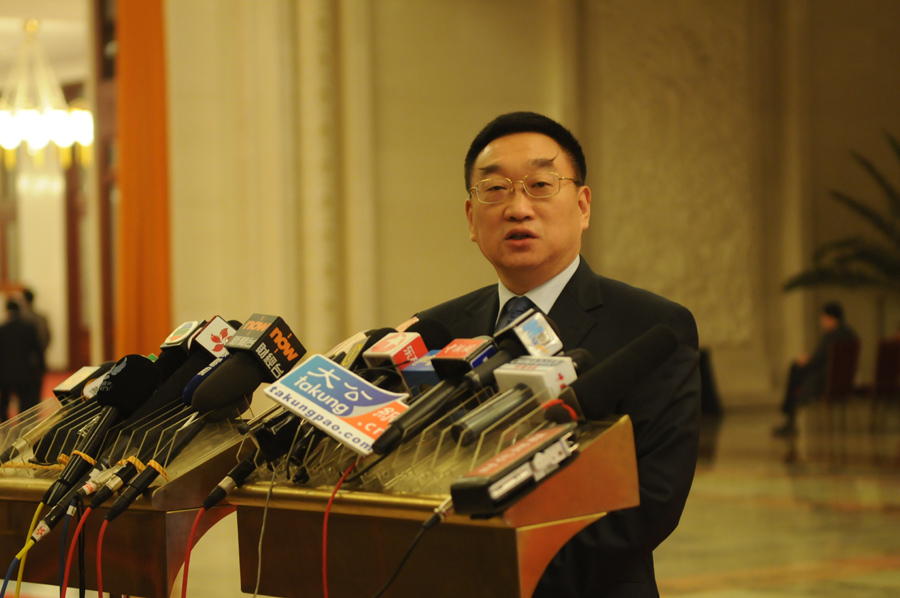 3月15日(星期五)上午9時,十二屆全國人大一次會議在人民大會堂舉行第五次全體會議,決定國務院總理的人選;決定中華人民共和國中央軍事委員會副主席、委員的人選;選舉最高人民法院院長;選舉最高人民檢察院檢察長。圖為水利部部長陳雷接受記者群訪。翟子赫 攝