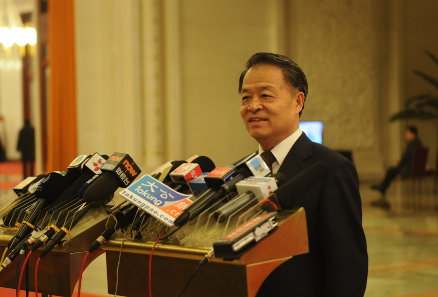 3月15日(星期五)上午9時,十二屆全國人大一次會議在人民大會堂舉行第五次全體會議,決定國務(wù)院總理的人選;決定中華人民共和國中央軍事委員會副主席、委員的人選;選舉最高人民法院院長;選舉最高人民檢察院檢察長。圖為交通運輸部部長楊傳堂接受記者群訪。翟子赫 攝