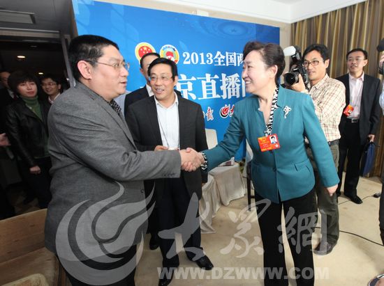 下午2:40許,省人大常委會秘書長翟魯寧一行來到位于中國職工之家的大眾日報·大眾網直播間,她與在場的大眾日報、大眾網、齊魯晚報等媒體記者一一握手,然后說:“我代表姜書記和柏主任來看望大家,感謝大家在兩會期間對山東的宣傳,主流媒體都發揮了很大的作用,發揮了正能量。”