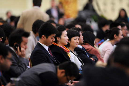 3月9日,幾位媒體記者等待記者會開始。當日,十二屆全國人大一次會議舉行記者會,外交部部長楊潔篪就“中國的外交政策和對外關系”答中外記者問。新華網(wǎng)/中國政府網(wǎng) 陳競超 攝