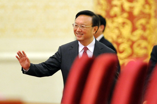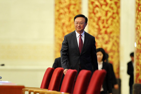 3月9日,楊潔篪步入會場。當日,十二屆全國人大一次會議舉行記者會,外交部部長楊潔篪就“中國的外交政策和對外關系”答中外記者問。新華網/中國政府網 陳競超 攝