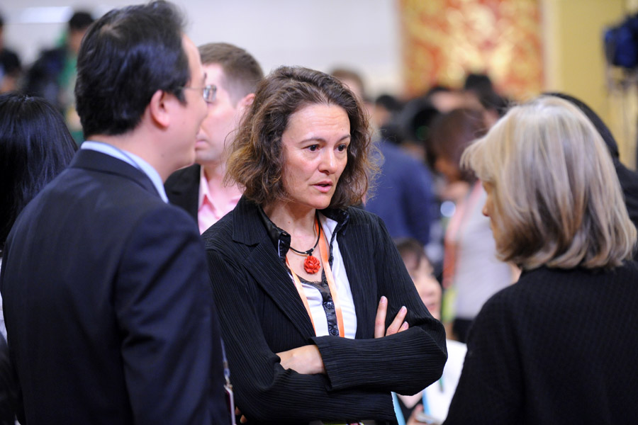 3月9日,幾位媒體記者在交談。當日,十二屆全國人大一次會議舉行記者會,外交部部長楊潔篪就“中國的外交政策和對外關系”答中外記者問。新華網/中國政府網 陳競超 攝