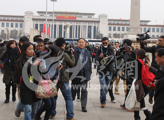 大眾網(wǎng)北京3月2日訊特派記者 王磊)“莫言!快……”“截住他!”今天14時20分 ,在全國政協(xié)十二屆一次會議預備會開始前,全國政協(xié)委員莫言剛從大巴車上下來,就被一位持長焦鏡頭相機的記者發(fā)現(xiàn),隨著他一聲大喊,百余名記者全部沖了上去。大眾網(wǎng)記者在采訪時看到,從下車到進入會堂, 莫言一路之字形步行路線,僅百余米的路走了足足5分鐘,但是卻一言未發(fā)。