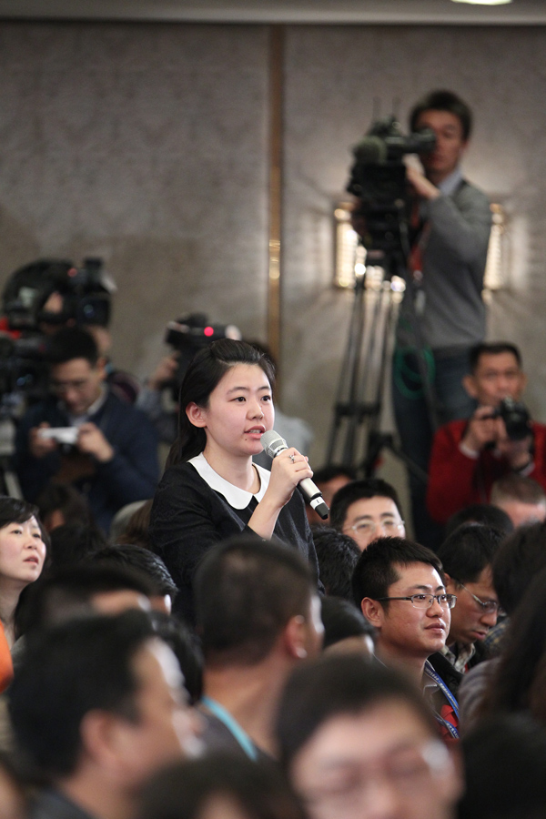 3月4日,十二屆全國人大一次會(huì)議在人民大會(huì)堂一層新聞發(fā)布廳舉行新聞發(fā)布會(huì),由大會(huì)發(fā)言人就會(huì)議議程和人大工作相關(guān)的問題回答中外記者的提問。圖為中國日?qǐng)?bào)記者提問。新華網(wǎng)/中國政府網(wǎng) 王悅威 攝