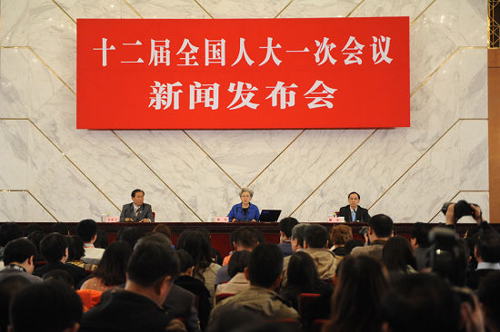 3月4日,十二屆全國(guó)人大一次會(huì)議在人民大會(huì)堂一層新聞發(fā)布廳舉行新聞發(fā)布會(huì),由大會(huì)發(fā)言人就會(huì)議議程和人大工作相關(guān)的問題回答中外記者的提問。圖為發(fā)布會(huì)現(xiàn)場(chǎng)。新華網(wǎng)/中國(guó)政府網(wǎng) 陳競(jìng)超 攝