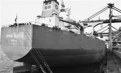 圖為正在接卸貨物的巴拿馬籍鐵礦石船舶“布魯斯”號。 楊 斌攝